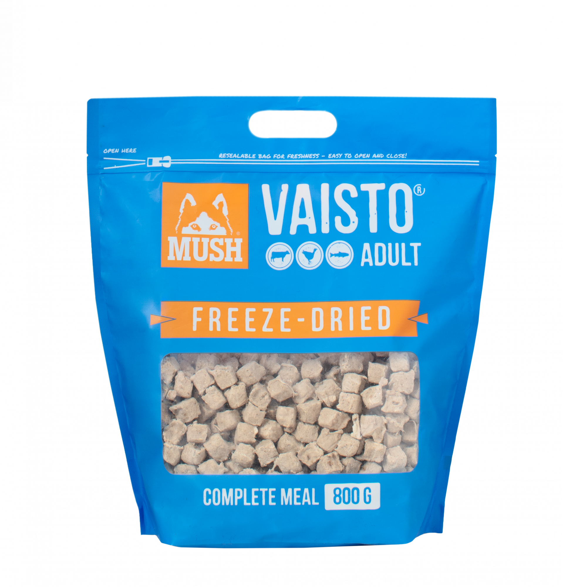 MUSH VAISTO BLUE FREEZE-DRIED (beef-turkey-salmon) is a freeze-dried complete food for dogs with the same high nutritional value and quality as regular raw food. Thanks to freeze-drying, the food is lightweight and takes up little space while the manufacturing process preserves its taste and nutrients – perfect for taking on trips, exhibitions, competitions, and hikes.