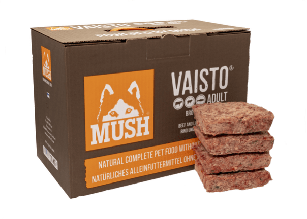 MUSH Vaisto® Braun (Rind-Lamm-Lachs) ist ein Alleinfutter für alle erwachsenen Hunde und ideal für Arbeits- oder Agility-Hunde, die eine höhere Kalorienzufuhr benötigen. Die Kombination aus Rind- und Lammfleisch, Lachs und Gemüse macht das Produkt reich an Ballaststoffen und vielen anderen natürlichen Vitaminen und Mineralien.