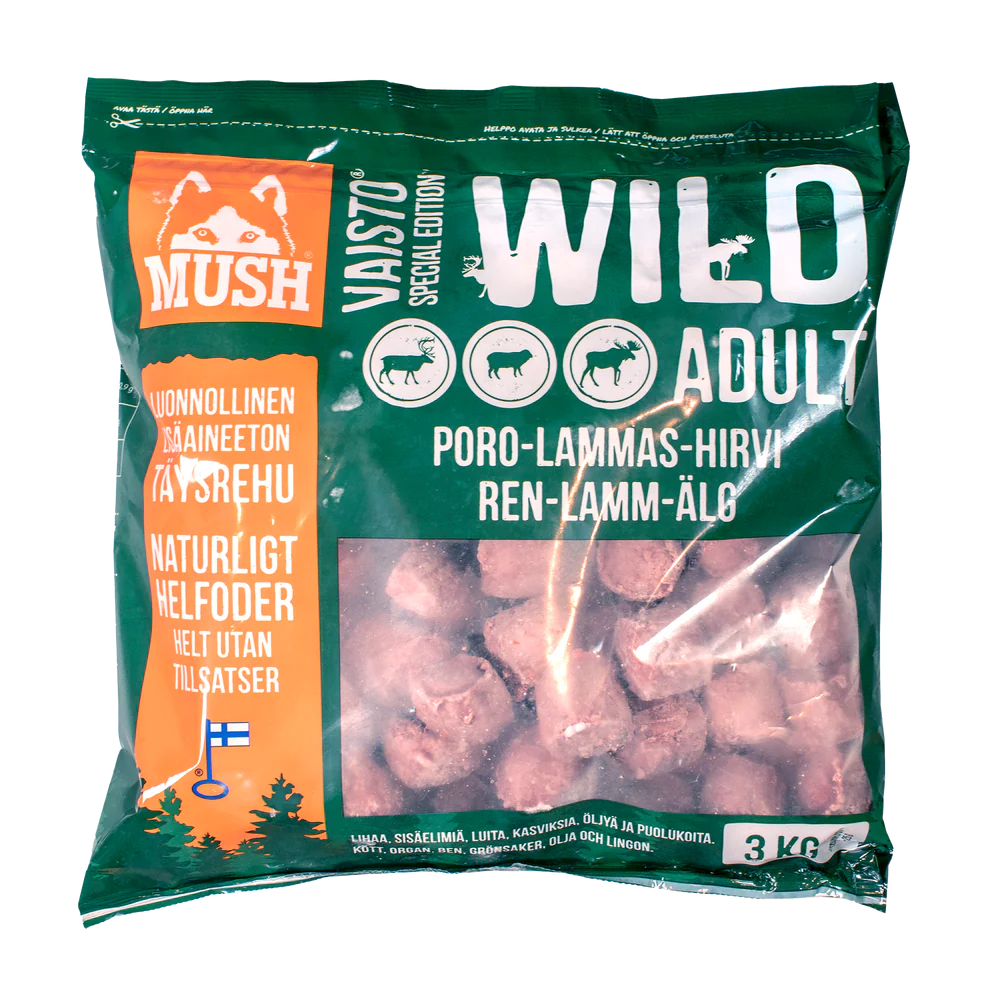 MUSH Vaisto® Wild (Rentier-Lamm-Elch) ist ein mildes und magenfreundliches Alleinfutter für ausgewachsene Hunde, hergestellt aus Tieren, die kein verarbeitetes Futter gegessen haben. Vaisto Wild ist besonders gut für empfindliche und allergische Hunde geeignet. Der hervorragende Nährstoffgehalt von Wildfleisch macht Wild zu einer schonenden Alternative. Knochen 7%, Leber 6%.